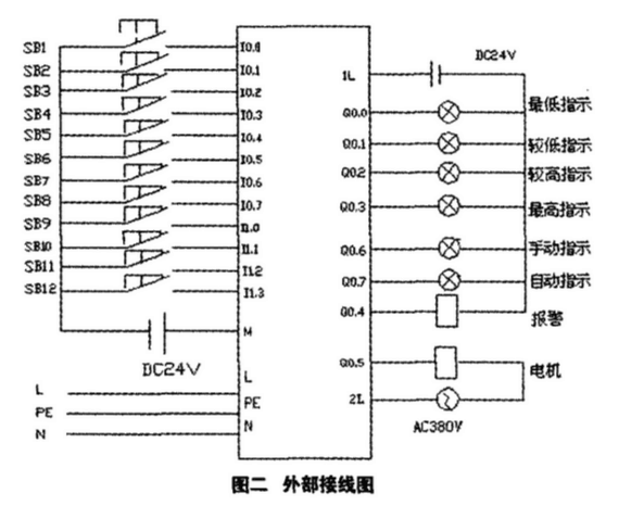 為實(shí)現(xiàn)液位的手動(dòng)/自動(dòng)控制,本人實(shí)驗(yàn)機(jī)型是采用“西門子”公司制造的S7-200型編程器,主要參數(shù)如下:需要輸入點(diǎn)10個(gè),輸出點(diǎn)7個(gè),選用西門子S7-200 17點(diǎn)I/O單元的PLC,輸入光電隔離,輸出繼電器隔離,負(fù)載能力強(qiáng),自備電源24V。液位檢測采用干簧管傳感器檢測,液位設(shè)定采用雙位旋鈕,系統(tǒng)具有手動(dòng)啟泵、停泵和確認(rèn)按鈕;輸出選用電子音響報(bào)警器和24V直流指示燈、繼電器。參見圖二系統(tǒng)外部接線圖。