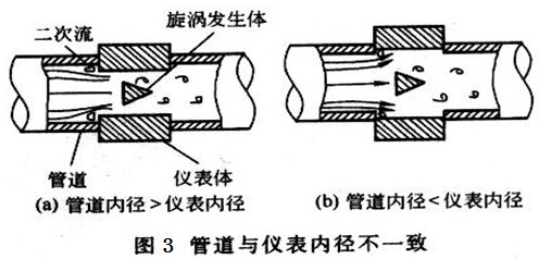 而渦街流量計(jì)與安裝管道內(nèi)徑也會存在誤差,或大或小,如圖3所示,當(dāng)被測介質(zhì)經(jīng)過時,也會發(fā)生二次流動,對測量結(jié)果產(chǎn)生波動影響。