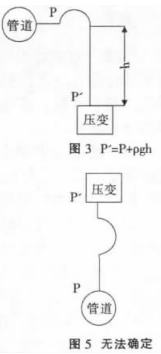 建議采用圖2的安裝方式,如不得已需要選擇圖3、圖4的安裝方式一定要對壓力進(jìn)行補(bǔ)償。不建議按照圖5的方式安裝,因?yàn)闊o法確定P'與P的關(guān)系。
