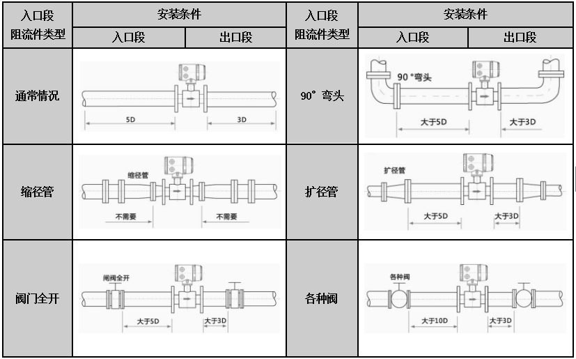 4、流量計的上下游管道應(yīng)與儀表的口徑相同,連接法蘭或螺紋應(yīng)與儀表的法蘭和螺紋匹配,儀表上游直管段長度應(yīng)保證是儀表公稱口徑的10倍,下游直管段長度應(yīng)保證是儀表公稱口徑的5倍。