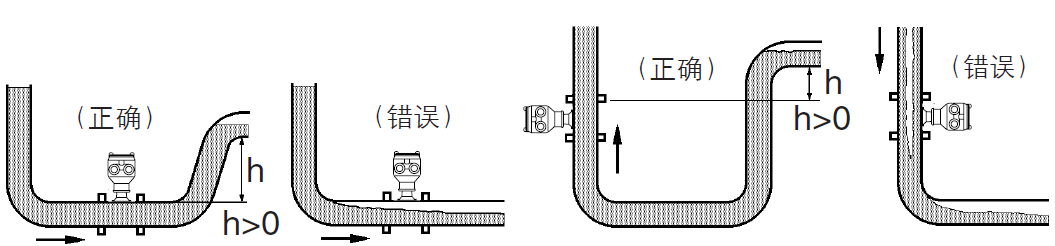 3、測量液體的壓力傳感器及變送器或壓力變送器的導(dǎo)壓管,為了減少測量誤差提高測量精度,導(dǎo)壓管出容器應(yīng)沿測量zui低液面水平方向敷設(shè)足夠長的距離(大于500mm)。使之保證液面底部水平位置變化。