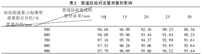 管道結(jié)垢,不但造成管徑誤差,還會使聲波發(fā)生散射,降低超聲波流量計的測量精度。結(jié)垢過厚時,儀表甚至不能工作。表2為管道結(jié)垢對流量測量的影響計算表。
