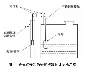 分體式磁翻板液位計的安裝步驟如下: ①通過計算浮力和配重, 在槽體頂部合適位置安裝定滑輪, 在槽外合適位子安裝磁翻板傳感裝置; ②用直徑為 3 mm 的不銹鋼繩連接浮子和配重, 鋼繩長度根據(jù)液位來計算。這里特別要注意, 磁翻板要反向安裝。