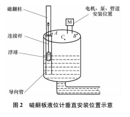圖 2 中, B 點靠近電機和泵, 磁翻板液位計安裝在此處既影響電機及泵的檢修, 又因泵附近液位的環(huán)流波動較大, 對浮子導向管沖刷嚴重, 故 B 點不合理; C 點處因有管道通過, 不便維護且影響管道和泵、 電機等的起吊更換, 故也不能選擇 C 點; A 點遠離泵和電機, 且有足夠的空間安裝翻板, 便于維護,所以 A 點較為合適。