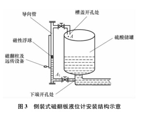 側(cè)面安裝方式的關鍵點在于: ①酸槽內(nèi)壁襯有瓷磚, 故引流管上開孔應選擇槽蓋合適位置, 下孔好在進口管上, 且均需加閥門, 便于維護; ②考慮管內(nèi)硫酸在極端天氣時對磁翻柱及測量裝置的影響,因本公司循環(huán)槽溫度在75 ℃左右, 為避免夏天溫度過高影響傳感器測量, 冬天防凍, 管徑 D 應在 80mm 以上可保證正常測量。
