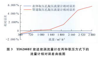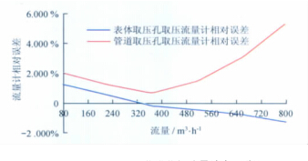 從以上數(shù)據(jù)表和曲線圖中可以看出: 天然氣流量計(jì)型號(hào)一定的情況下, 用表體取壓孔取壓方式檢定流量計(jì)時(shí)流量計(jì)的線性度較好, 用管道取壓孔取壓方式檢定流量計(jì)時(shí)流量計(jì)的線性度較差; 流量測(cè)點(diǎn)相同的情況下, 表體取壓孔取壓檢定方式的流量計(jì)誤差較小, 管道取壓孔取壓檢定方式的流量計(jì)誤差較大; 兩種取壓方式引起的誤差隨著流量的增大而逐漸增大, 在流量為2 ?。?0 0m3 /h時(shí)兩者相差近6. 2% , 遠(yuǎn)遠(yuǎn)超出了流量計(jì)的準(zhǔn)確度等級(jí)。所以, 在天然氣流量計(jì)的檢定過(guò)程中, 應(yīng)避免在流量計(jì)表體取壓孔以外的地方取壓進(jìn)行檢定。