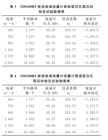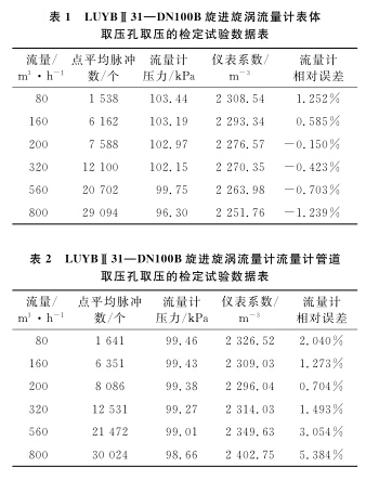 以使用**的D N 1 0 0 B天然氣流量計(jì)為例, 系統(tǒng)運(yùn)行時(shí)間為6 0s , 標(biāo)準(zhǔn)裝置的滯止平均溫度為 2 8. 9℃ , 空間平均濕度為 3 0% , 流量計(jì)的平均溫度為 2 8. 3℃ , 在表體取壓孔取壓和管道取壓孔取壓的流量計(jì)檢定試驗(yàn)數(shù)據(jù)分別如表 1 、 2 所示。