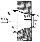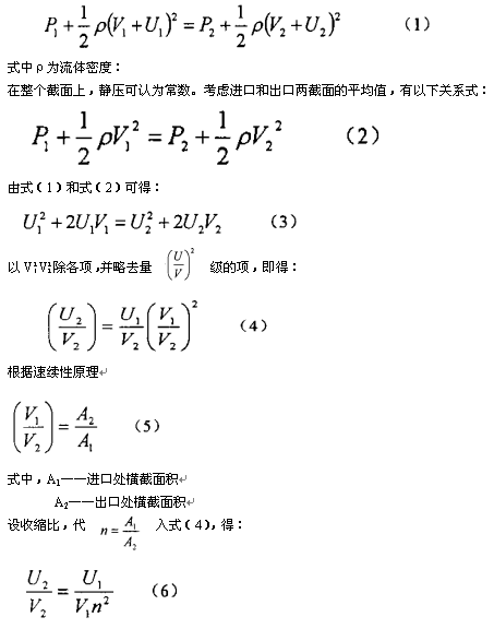 設(shè)整流器進口處壓力為P1,平均流速為V1,某點上的速度不均勻度為U1,出口處壓力為P2,平均流速為V2,通過進口處某點同一流線,在出口處的速度不均勻度為U2,沿該流線,由伯努利方程得: |