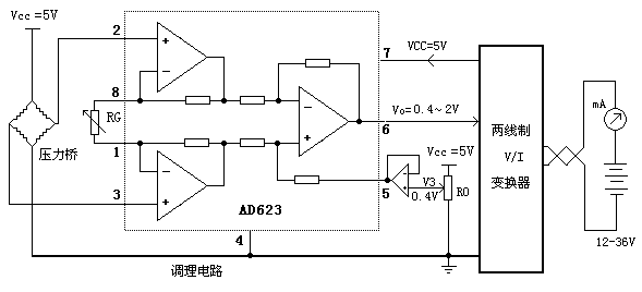 四、.兩線制壓力變送器設(shè)計 壓力橋、稱重傳感器輸出信號微弱,都屬于mV級信號。這一類小信號一般都要求用差動放大器對其進(jìn)行*先級放大。一般選用低失調(diào)、低溫飄的差動放大器。另外在兩線制應(yīng)用中,低功耗也是必需的。AD623是常用的低功耗精密差動放大器,常用在差分輸出前級的放大。 AD623失調(diào)大200uV,溫飄1uV/度,在一般壓力變送應(yīng)用保證了精度足夠。 R0將0.4V疊加在AD623的REF腳(5腳)上,在壓力=0情況下通過調(diào)整R0使輸出4mA,再調(diào)整RG輸出20.00mA,完成校準(zhǔn)。 電路設(shè)計時需注意,壓力橋傳感器相當(dāng)于一個千歐級的電阻,耗電一般比較大。適當(dāng)降低壓力橋的激勵電壓可以減小耗電電流。但是輸出幅度也隨之下降,需要提高AD623的增益。圖6給出的傳感器采用恒壓供電,實際應(yīng)用中大部分半導(dǎo)體壓力傳感器需要恒流供電才能獲得較好的溫度特性,可以用一個運(yùn)放構(gòu)成恒流源為其提供激勵。