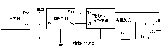 一、.兩線制變送器的結(jié)構(gòu)與原理 兩線制變送器的原理是利用了4~20mA信號為自身提供電能。如果變送器自身耗電大于4mA,那么將不可能輸出下限4mA值。因此一般要求兩線制變送器自身耗電(包括傳感器在內(nèi)的全部電路)不大于3.5mA。這是兩線制變送器的設(shè)計根本原則之一。 從整體結(jié)構(gòu)上來看,兩線制變送器由三大部分組成:傳感器、調(diào)理電路、兩線制V/I變換器構(gòu)成。傳感器將溫度、壓力等物理量轉(zhuǎn)化為電參量,調(diào)理電路將傳感器輸出的微弱或非線性的電信號進(jìn)行放大、調(diào)理、轉(zhuǎn)化為線性的電壓輸出。兩線制V/I變換電路根據(jù)信號調(diào)理電路的輸出控制總體耗電電流;同時從環(huán)路上獲得電壓并穩(wěn)壓,供調(diào)理電路和傳感器使用。 除了V/I變換電路之外,電路中每個部分都有其自身的耗電電流,兩線制變送器的核心設(shè)計思想是將所有的電流都包括在V/I變換的反饋環(huán)路內(nèi)。如圖,采樣電阻Rs串聯(lián)在電路的低端,所有的電流都將通過Rs流回到電源負(fù)極。從Rs上取到的反饋信號,包含了所有電路的耗電。在兩線制變送器中,所有的電路總功耗不能大于3.5mA,因此電路的低功耗成為主要的設(shè)計難點。下面將逐一分析各個部分電路的原理與設(shè)計要點。