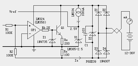 五、穩(wěn)定性和安全性的考慮 工業(yè)環(huán)境下環(huán)境惡劣且對可靠性要求高,因此兩線制變送器的設(shè)計上需要考慮一定的保護(hù)和增強(qiáng)穩(wěn)定性措施。 1.電源保護(hù)。 電源接反、超壓、浪涌是工業(yè)上常見的電源問題。電源接反是設(shè)備安裝接線時容易發(fā)生的錯誤,輸入口串一只二極管即可防止接反電源時損壞電路。如果輸入端加一個全橋整流器,那么即使電源接反仍能正常工作。為防止雷擊、靜電放電、浪涌等能量損壞變送器,變送器入口處可以加裝一只TVS管來吸收瞬間過壓的能量。一般TVS電壓值取比運(yùn)放極限電壓略低,才能起到保護(hù)作用。如果可能遭受雷擊,TVS可能吸收容量不夠,壓敏電阻也是必需的,但是壓敏電阻本身漏電會帶來一定誤差。 2.過流保護(hù)。 設(shè)備運(yùn)行過程中可能有傳感器斷線、短路等錯誤情況發(fā)生?;蛘咻斎肓勘旧砗苡锌赡艹砍蹋兯推鞅仨毐WC任何情況下輸出不會無限制上升,否則有可能損壞變送器本身、電源、或者遠(yuǎn)方顯示儀表。 圖中Rb和Z1構(gòu)成了過流保護(hù)電路。無論什么原因?qū)е翺P1輸出大于6.2V(1N4735是6.2V穩(wěn)壓管),都會被Z1鉗位,Q1的基極不可能高于6.2V。因此Re上電壓不可能高于6.2-0.6=5.6V,因此總電流不會大于Ue/Re = 5.6V/200=28mA。 3.寬電壓適應(yīng)能力。 一般兩線制變送器都能適應(yīng)大范圍的電壓變化而不影響精度。這樣可以適用各類電源,同時能夠適應(yīng)大的負(fù)載電阻。對電源敏感的部分是基準(zhǔn)源,同時基準(zhǔn)源也是決定精度的主要元件。3樓圖中基準(zhǔn)通過R5限流,當(dāng)電源電壓變化時,R5上電流也隨之改變,對基準(zhǔn)穩(wěn)定性影響很大。附圖中利用恒流源LM334為基準(zhǔn)供電,電壓大范圍變化時,電流基本不變,保證了基準(zhǔn)的穩(wěn)定性。 4.退藕電容 一般的電路設(shè)計中,每個集成電路的電源端都會有退藕電容。在兩線制變送器上電時,這些電容的充電會在瞬間導(dǎo)致大電流,有可能會損壞遠(yuǎn)方儀表。因此每個退藕電容一般不超過10nF,總退藕電容不宜超過50nF。入口處一個10nF電容是必需的,保證長線感性負(fù)載下,電路不震蕩。